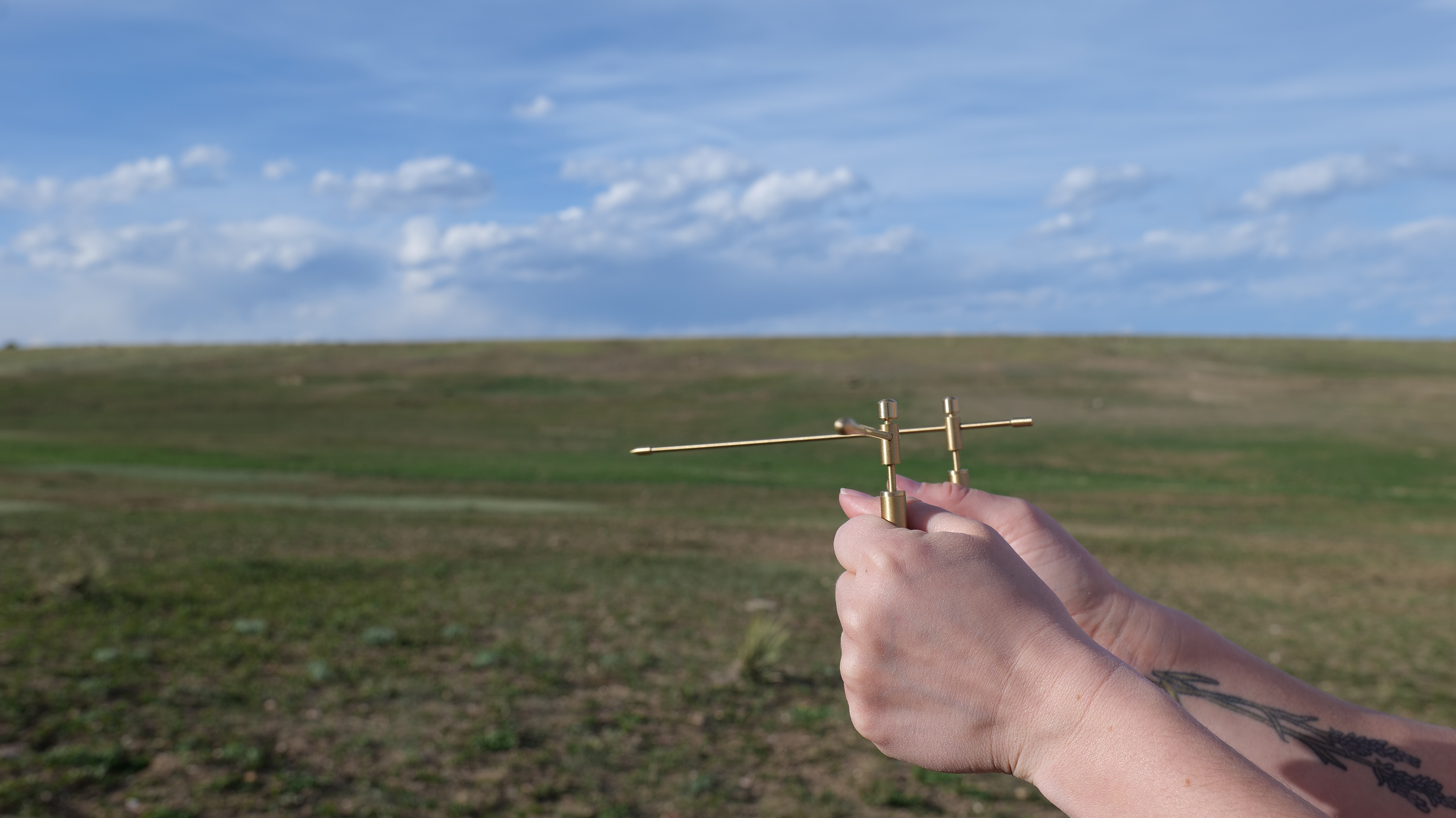 Constructed from a newly devised syllabary comprising 50 distinct and intuitively selected graphemes, this poem serves as an exploration of the interpretive spirit of place when synthesized through artist (the Conduit) as surveyor, lens, and editor. The rudiments of this linguistic framework were selected by the Conduit in collaboration with the Spirit of Place, as dictated through the crossing and uncrossing of divining rods held in the hands of the Conduit while traversing the landscape. The Conduit intuitively selected each grapheme as dictated by the spirit of place and arranged a poetic iteration of this novel syllabary. As asserted by philosopher Jacques Derrida in his 1967 book “Of Grammatology,” “there is no outside-text.”